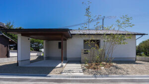 この事例では、偏西風が強く吹く地域特性を活かし、風の動線を家の設計に取り入れ、パッシブに涼を採り込む工夫が施されています。建物と庭が一体となった空間が、涼やかな暮らしと自然との一体感を支えています。